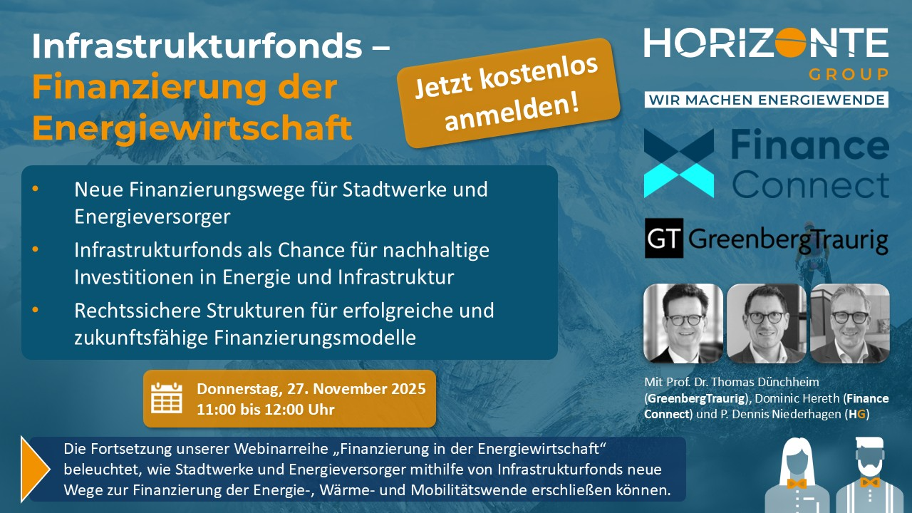 Im Rahmen der Webinarreihe „Finanzierung in der Energiewirtschaft“ zeigen wir gemeinsam mit der HORIZONTE-Group AG und Greenberg Traurig Germany, LLP, welche alternativen Finanzierungsstrukturen für Stadtwerke und kommunale Versorger künftig entscheidend sein können – und welche Vor- und Nachteile sie mit sich bringen.